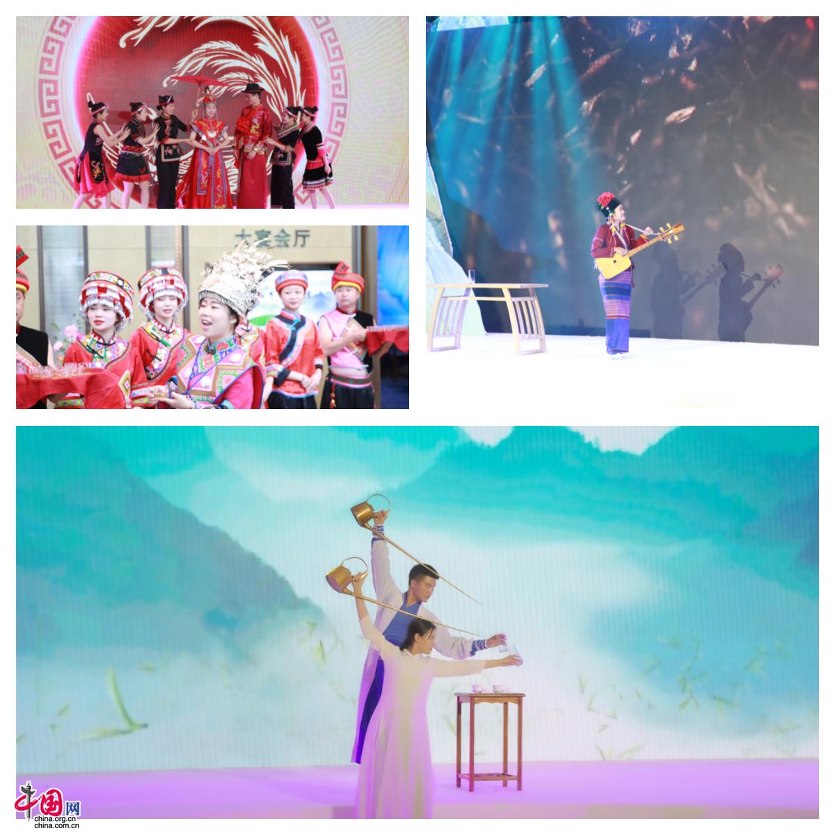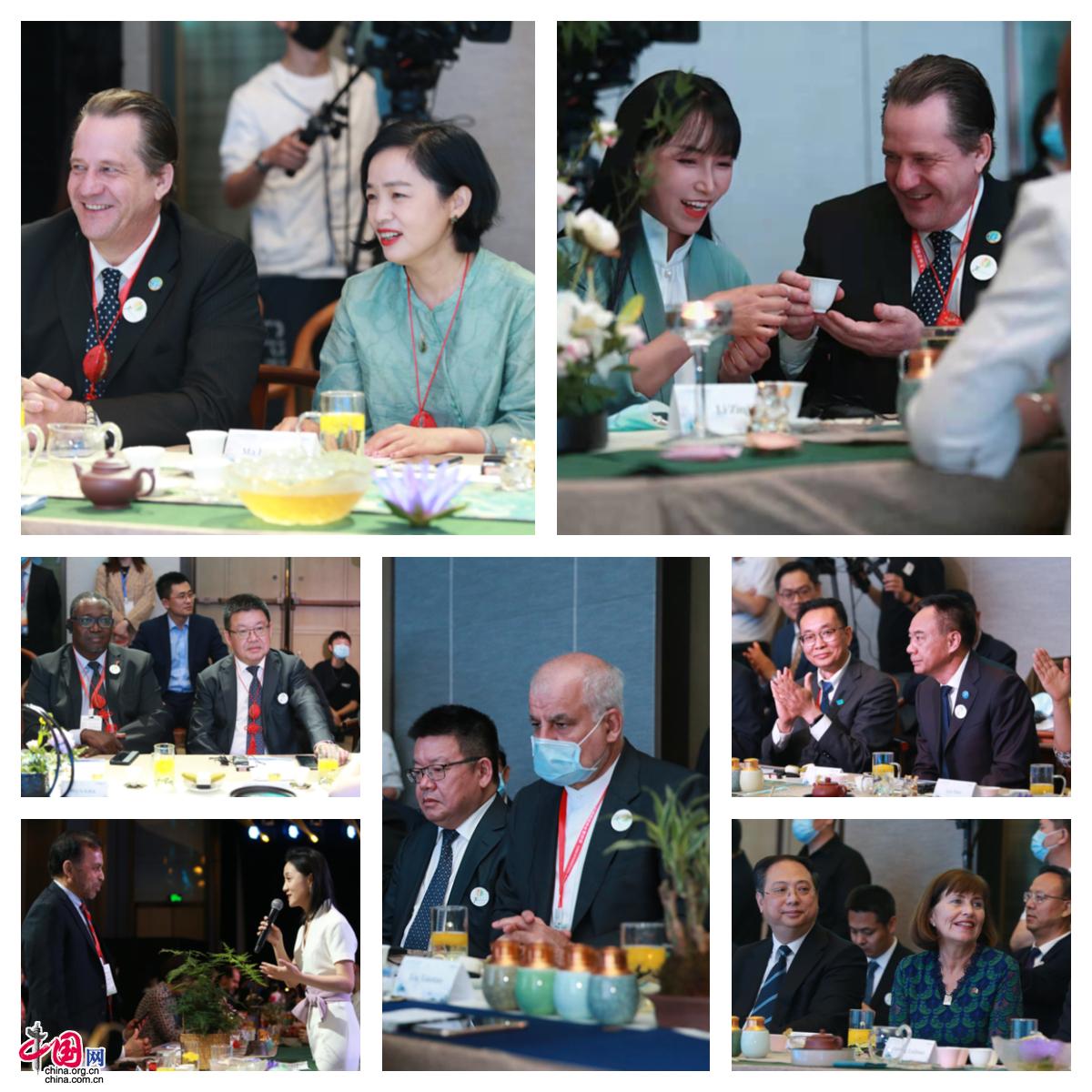 本場“大使品茶”是一場精彩絕倫的茶文化盛宴。一道湖北恩施土家族的“攔門茶”迎接中外嘉賓入場,“千年茶農(nóng)”云南景邁山布朗族表演、福建畬族“新娘泡”文化展示、四川茶館文化和“龍行十八式”演繹、《南洋夜話》茶文化融合劇、茶韻旗袍秀等豐富多彩的節(jié)目輪番上演。活動現(xiàn)場,嘉賓分別品鑒了由苦至甘、回味悠長的云南普洱茶,濃醇鮮爽、葉亮紅明的福建坦洋工夫茶,湯色綠亮、清新爽口的洪雅綠茶,香高味濃、形美色亮的川紅工夫茶以及“紅濃陳醇”、特有檳榔香氣的廣西六堡茶。